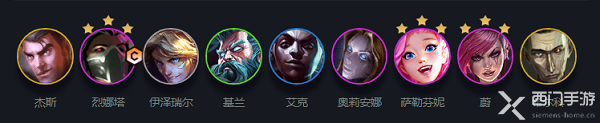 1.阵容成员:杰斯、烈娜塔、伊泽瑞尔、基兰、艾克、奥利安娜、萨勒芬妮、蔚、希尔科