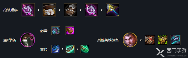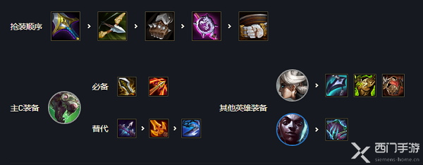 解析:主C老鼠:无尽、轻语、飓风。替代:蓝buff、杀人剑、巨杀,副CEZ:电刀n副C艾克:鬼书n主T青钢影:反甲、龙牙、狂徒,青钢影、炼金、狼人三块大肉站在第一排抗伤害,老鼠最好是跳中间,防止跳进人堆里被秒杀。
