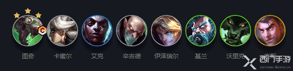 1、阵容成员:图奇+卡密尔+艾克+辛吉德+伊泽瑞尔+基兰+沃里克+杰斯
