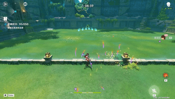 当有「直球」靠近外圈时,使用元素战技,击破「直球」的同时,「变化球」也可以击破,一定时间后,击球难度提升,击球分数也翻倍。