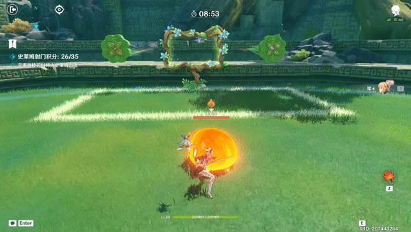 利用琴的元素战技,将史莱姆投入「藤蔓球门」获得积分,具体操作:琴长按元素战技,调整一定角度,避开移动门,将史莱姆投入「藤蔓球门」。