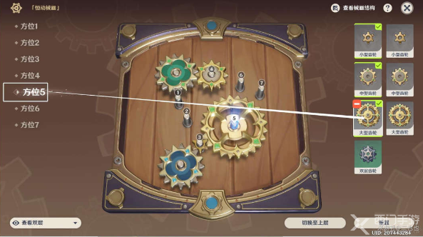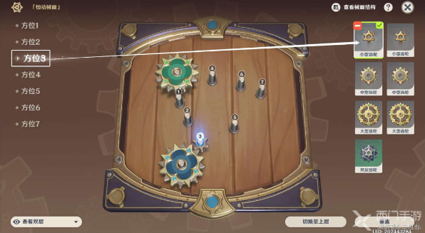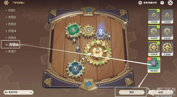 第三天齿轮摆放相对于前两天新增了一种齿轮‘双层齿轮”,对于“双层齿轮”来说,没有切换上下层的操作,但可以点击屏幕右下角的“翻转”改变齿轮的朝向。同时,第三天的解谜解法不唯一,两种齿轮摆放攻略与结果展示如下: