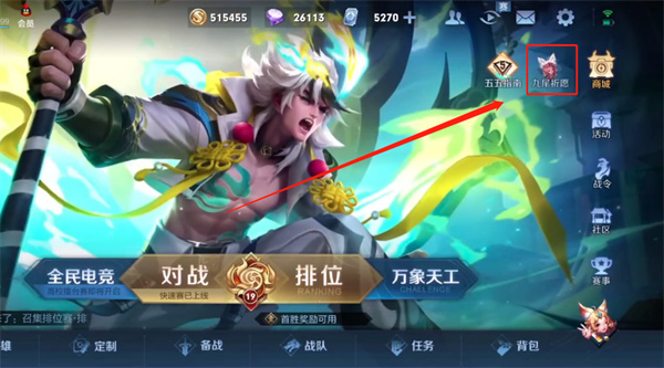 1、打开游戏登录你的账号,进入游戏主界面后,点击右上角的“九尾祈愿”进入活动,或通过主界面点击“祈愿”-“九尾祈愿”进入;