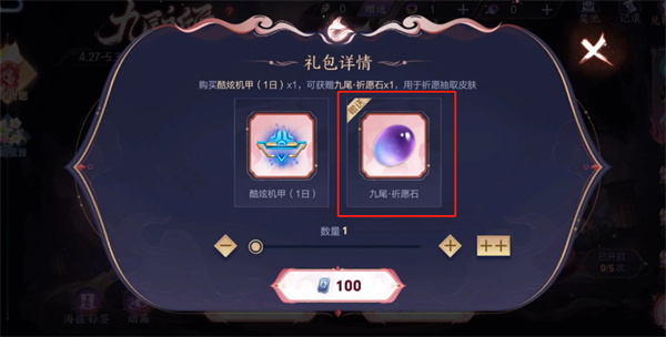 3、我们需要花费100点券购买礼包,获得九尾祈愿石来抽奖,抽一次需要花费1个九尾祈愿石;