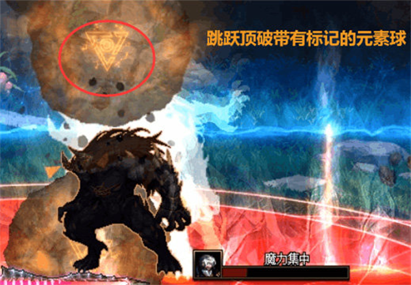 5、第四个机制是【土系元素球】,BOSS召唤带有三角标记土系元素球,并在短暂时间后发生大爆炸,角色通过跳跃撞击元素球,3次后元素球消失,BOSS最终技能“魔力集中”机制发动时,元素球数量更多,这个时候只要注意躲避即可。