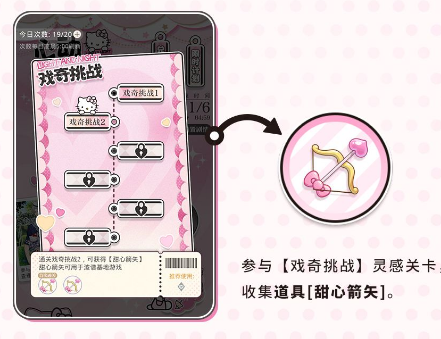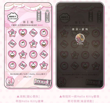 在BINGO小游戏【波谱基地】中,消耗[甜心箭矢]找出隐藏在靶子后的Hello Kitty徽章,每找到一枚Hello Kitty徽章即可获得道具[幸运钥匙]。