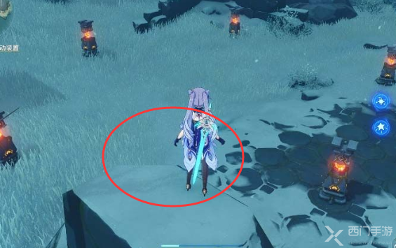 3.在下图中,玩家角色站立的地方就有一个火精灵,围着石碑走一圈,一个一个走,即可解谜;