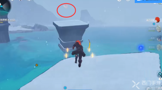 4.我们需要牵引火精灵,先爬到石柱上,然后我们也跟着爬上去,这个时候火精灵会去水上的石碑上,我们也跟过去;