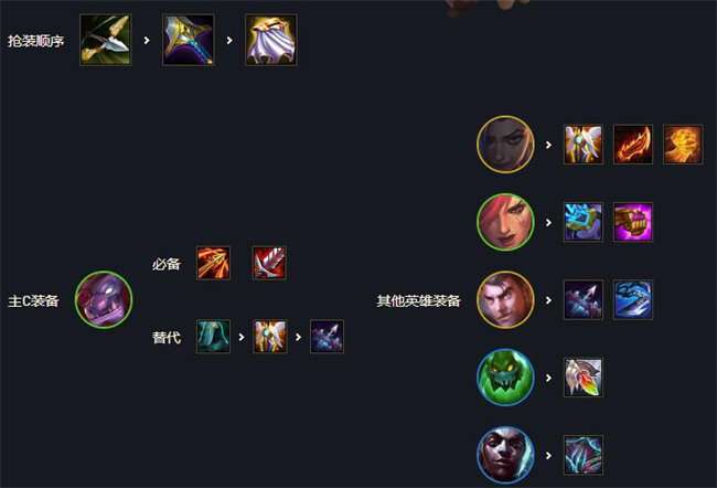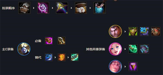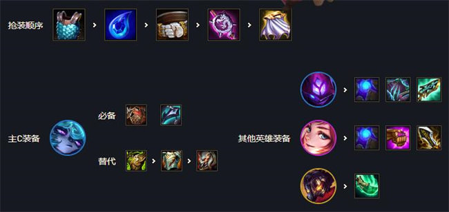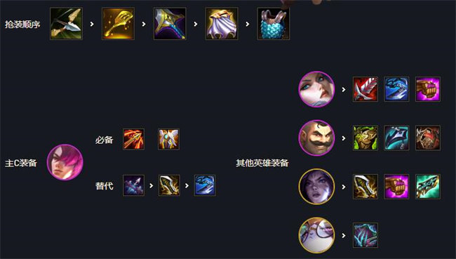 以卡特和泰隆为核心的6刺客阵容,在s6输出更高的版本中刺客可以很好切入后排终结对手的核心输出点,在2个核心输出的存在下有很好的输出稳定性。