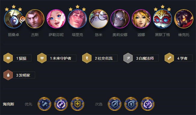 在学者羁绊的加成下阵容整体就有不错的回蓝效率,另外丽桑卓作为一个低费英雄也很容易升星,轻松就可以升级到三星,还有大发明家和塔里克也能轻松升级到三星。