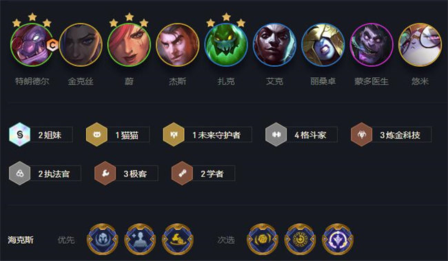 前期用极客等角色过渡,等到了8级之后有了杰斯和金克丝就将前期过渡的角色卖掉,给他们核心装备,另外再加上塔姆和悠米,算是个半九五阵容。