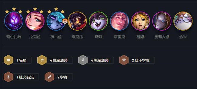 薇古丝是该阵容的核心,在黑白魔法师的加成下薇古丝一个角色就可以吸收所有伤害,后排有拉克丝、玛尔扎哈等来提供输出,不断的消耗就能击溃对手。