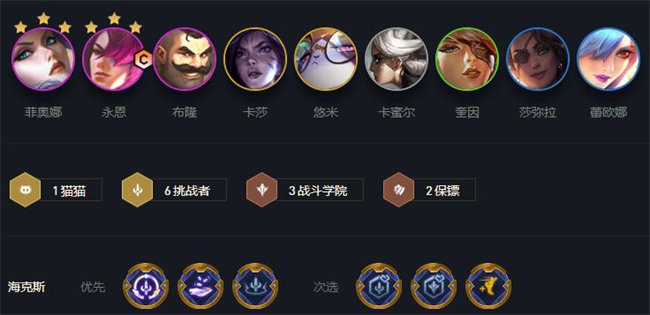 跟战斗学院阵容不一样的是挑战者羁绊下的永恩有更快的攻速,输出更强了,而且还有剑姬作为副C,让该阵容是多输出点,不怕输出不够,可以快速收割。