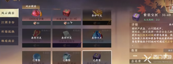 1、紫色品级装备:可在前期任务获取,各个副本也会掉落,除此之外在风云商店也可换取2个紫色装备的箱子,属于过度装备,很快就会换掉;