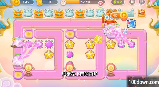 2、在左侧放星星塔继续清理中间的道具,兔子来了还是要打一下,别漏掉了,中间道具清理完放星星塔,还是往左清理,可以放星星塔和魔法球组合;