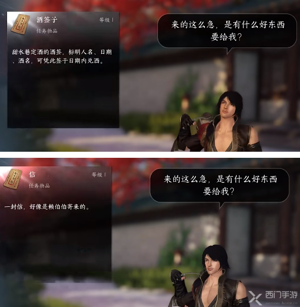 3、在这里玩家和他进行对话,需要出示信和酒签子,鞥对话结束,任务完成了。