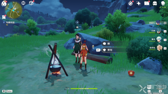 3、在琳面前的篝火处使用[烹饪]功能,如果篝火熄灭是不能烹饪的,需要用火属性的攻击再次点燃篝火才能烹饪(安柏的弓箭蓄力可以点火);