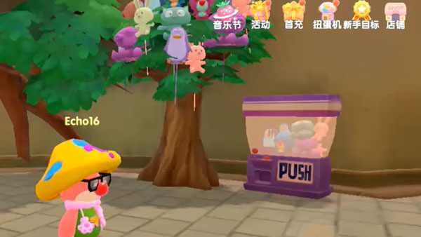 娃娃机在【游戏小屋】的左侧可以找到,通过地图导航【弗利德】自动前往游戏小屋,在一颗挂满了娃娃的树旁边就可以找到娃娃机了。