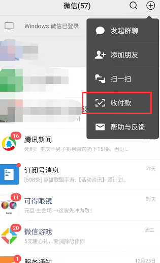 1、进入微信之后,点击右上角的+号,选择【收付款】;
