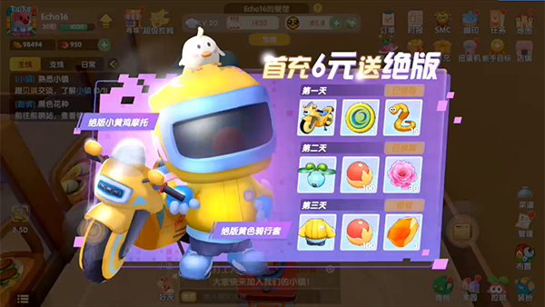 在游戏中首次充值6元或者6元以上,就可以领取首充奖励,连续领取三天,在第三天即可获得黄色骑行服,同时还可以集齐小黄鸡骑手套装。