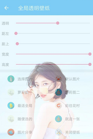 3.用户可以挑选一款自己喜欢的壁纸类型选择使用,在相应的设置界面可以调节透明度以及宽度和高度等选项;