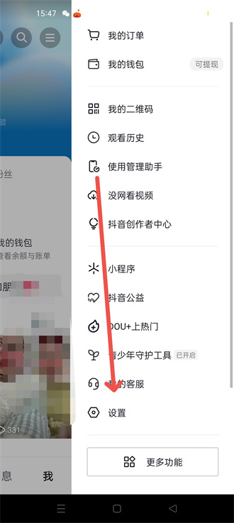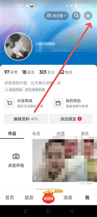 1、进入抖音主页后,从【我】的页面中,找到【三横】,进入此选项里。