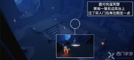 这个冥想任务的位置是在禁阁一层过了双人门再往前走一点,之后在石碑前光圈处打坐并冥想。