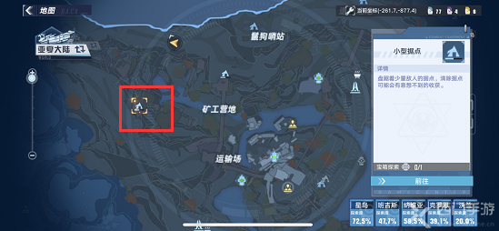 2、传送之后跟着地图指引走,到达矿工营地左侧的一个小型据点,具体如下图: