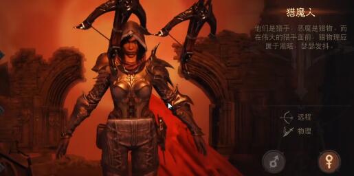 【猎魔人】:复仇的追踪者,使用手努的好手,猎魔人是无情的侠义之士,会从远处发起进攻;他们是经过训练的恶魔猎人,却身负悲惨的过去他们的家人被烈焰地狱的恶魔所害,猎魔人用锤炼的戒律来调和对烈焰地狱的仇恨,一往无前地发起进攻,直到他们的猎物任由自己摆布。