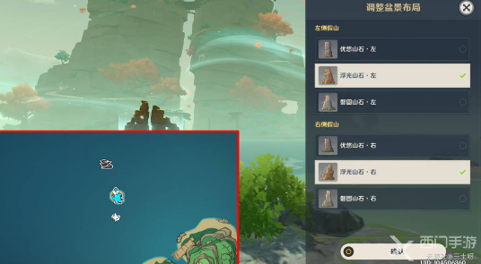 1、首先要来到布丁岛,更改盆景布局,左右两侧假山换成「浮光山石」(稻妻风格);