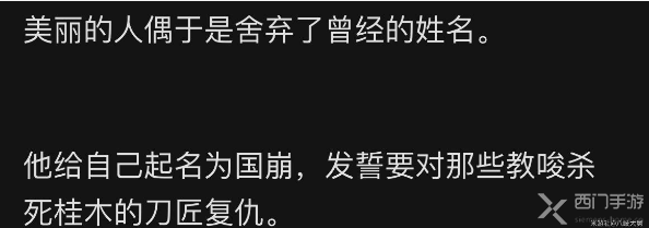 而通过之前了解到月下随歌而舞的无心人偶可知,散兵之所以要对刀将复仇大概率是因为御舆长正受匠人教唆咔嚓桂木所致,而其中长正并非御舆家嫡子,真正的嫡子御舆道启早已离开,为保全御舆家,也为了自己所谓的忠义…