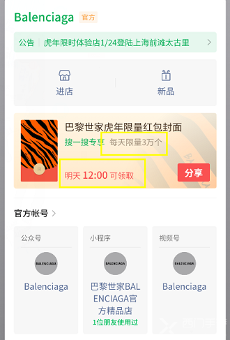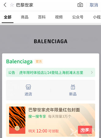 1、打开手机微信,点击上方的搜索框输入“巴黎世家”等品牌名称进行搜索,搜索后就会弹出对应的红包封面链接;