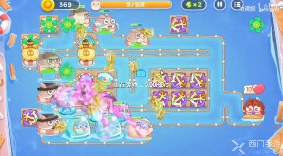2、之后几波,玩家要在中间两个空白处都放上炮台,左侧放烟花炮和冰冻炮,右侧可以全部放船锚炮;