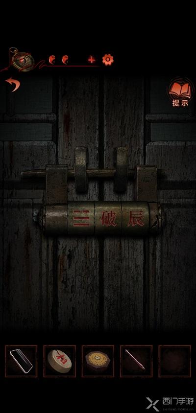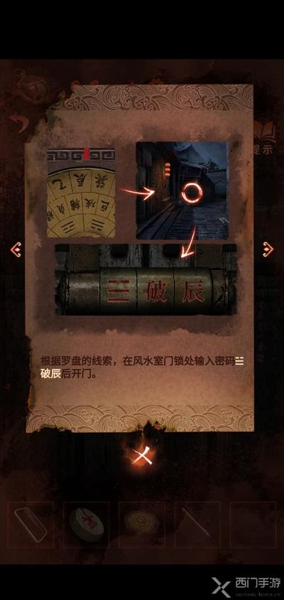 2、根据罗盘中的线索,在风水室门锁处输入密码【八卦方位如图、破、辰】就可以开门;