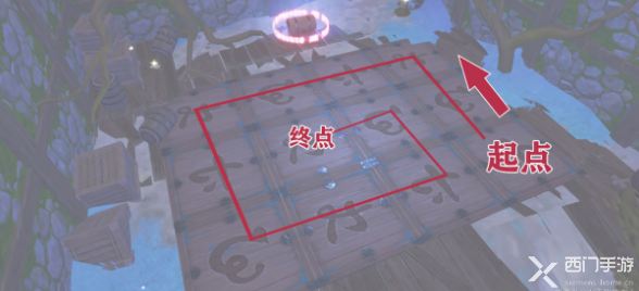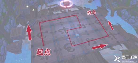 小木屋周围有三个刻着神秘符号的地板,需要玩家依次踩亮地板,踩亮的顺序如下: