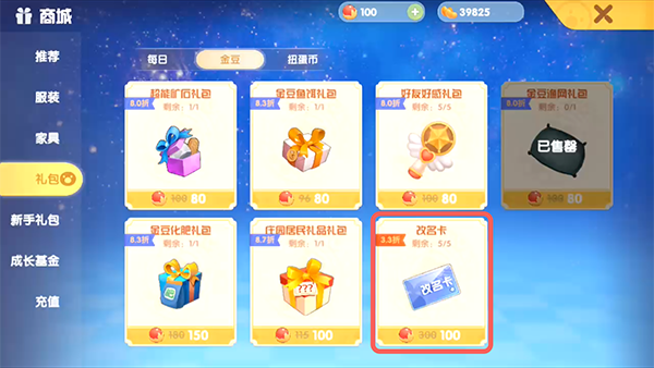4.可通过游戏界面左上角的【商城-礼包-金豆】,花费100金豆购买改名卡。