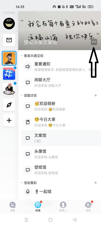 2、频道主点击自己频道的右上角【...】,点击后会弹出许多的选项,在里面找到邀请函的选项点击;