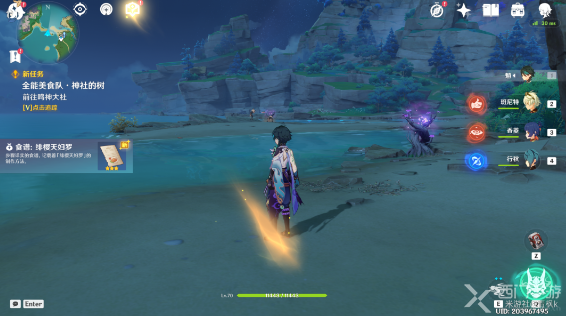 1、在玩家刚刚从离岛踏入稻妻城的道路上,在海滩上会遇到旭东一行人,他们是为精进自己的厨艺而前往世界各地旅行的〔全能美食队〕;