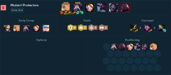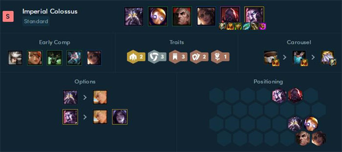 该阵容不仅有前排塞恩大虫子等非常肉,又有巨像减免伤害,包含变形的额外输出能力,在6人口的时候可以成型,可以速升3星卡萨丁作为核心输出。