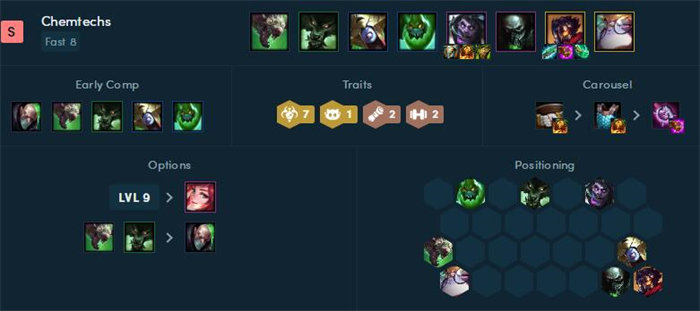 依靠炼金强大的回复能力,蒙多可以在前排吸收很多伤害,还有其他炼金英雄的攻速也不错,是一个攻防一体的阵容,机械先驱作为大核在后排输出。