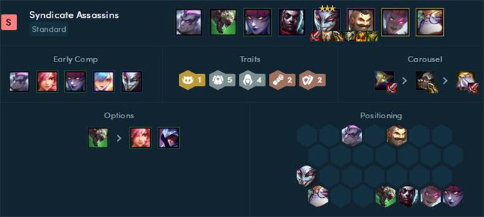 在辛迪加吸血和刺客暴击输出的加成下,小丑可以作为唯一单核输出,配备饮血剑之后每次输出都能有大量回复,而布隆作为前排吸收格挡伤害。