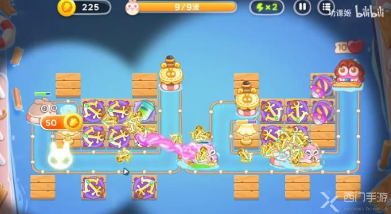 4、最后几波,玩家继续在右侧道路位置放置船锚炮,多放几个,并且把其他的都升级,基本就可以过关了。