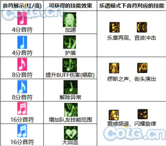 ps:在释放乐谱技能时角色的部分技能会变成音符形式,具体如下表: