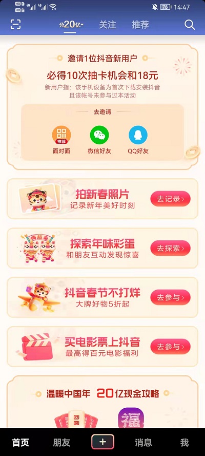 邀请抖音的新用户不仅是拥有大量的抽卡机会,还可以直接获得现金红包奖励,新用户是指该手机设备首次下载安装抖音,且账号没有参与过该活动的新用户,可以获得10次抽卡机会,还有18元大额红包奖励。