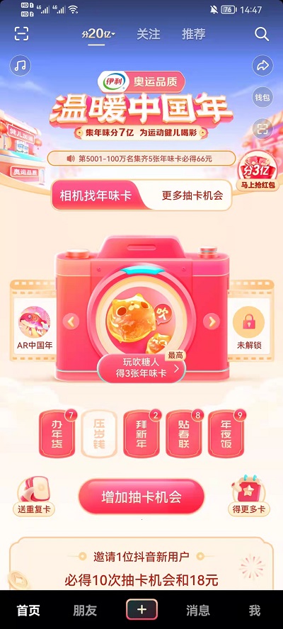 在此活动中,用户可以在抖音中打开相机功能,到处晃动就可以发现镜头中的虚拟物品,就可以看到各种祝福的东西,有机会获得年味卡,就可以有很大概率获得压岁钱卡,积极的参与活动可以增加概率;