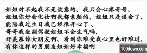 答案:哥哥我坐副驾驶姐姐不会生气吗、好美慕你女朋友啊、看到你难受我心里也好难过、有你这样的男朋友姐姐好幸福啊、姐姐对不起我不是故意的、我只会心疼哥哥、姐姐你好会化妆啊我都素颜的、姐姐只是误会了、能陪我过生日我已经很开心了。