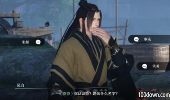 ①和晁白对话选择姑娘名字,【依霜】是一条分支,【桐花】【朱颜】是一条分支,这里选了【依霜】;