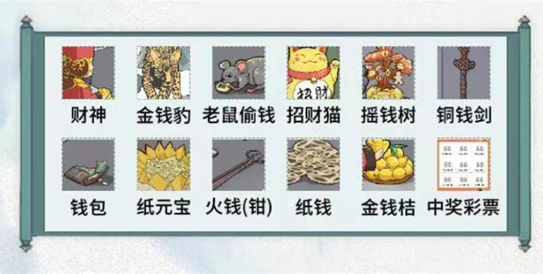 财神,金钱豹,老鼠偷钱,招财猫,摇钱树,铜钱剑,钱包,纸元宝,火钳,纸钱,金钱桔,中奖彩票