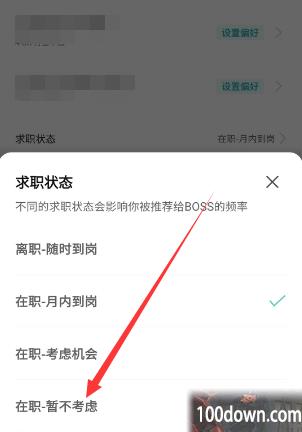 4、玩家只要在弹出来的页面里设置为【在职-暂不考虑】即可,这个就算是关闭了求职状态。