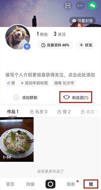 1、首先打开手机上的快手应用,点击右下角【我的】选项,进入个人信息界面,点击主页上的【粉丝团】选项;